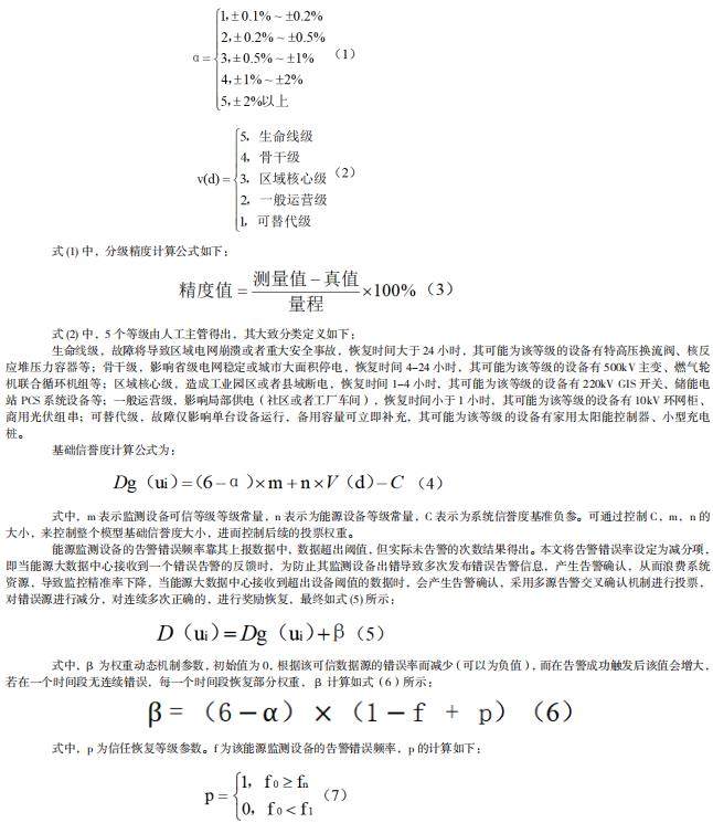 能源监测设备的告警错误频率靠其上报数据 ,数据超出阈值,但实际未告警的次数结果得出。本文将告警错误率设定为减分项,即当能源大数据中心接收到一个错误告警的反馈时,为防止其监测设备出错导致多次发布错误告警信息,产生告警确认,从而浪费系统资源,导致监控精准率下降,当能源大数据中心接收到超出设备阈值的数据时,会产生告警确认,采用多源告警交叉确认机制进行投票,对错误源进行减分,对连续多次正确的,进行奖励恢复,最终如式(5) 所示: