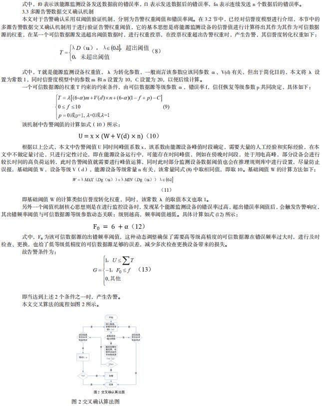 (3)交叉确认阶段:通过计算多个数据源的权重,判断是否达到设备告警阈值,达到则触发告警、产生响应,并向能源大数据中心中控中心发送信息,未超过则检查告警监测设备出错频率,过大则触发告警响应,发送信息至能源大数据中心中控中心,正常则不触发告警响应。