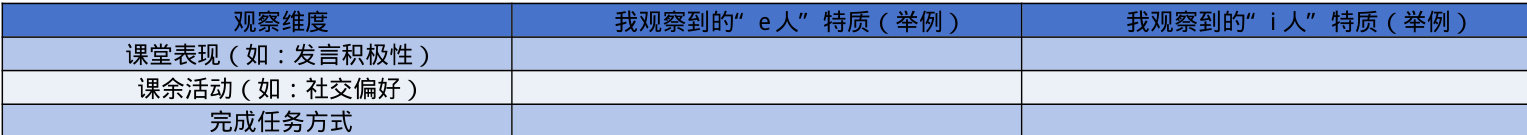 请你当一名“ 小小观察员” ,在身边找一找可能是“ e 人” 或“ i人” 的同学(不写名字,可描述特点),填写下表。