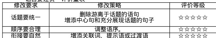 学生自由总结所学内容,教师整理形成更精细的评价量表,明确修改要求、修改策略和评价等级。如表所示: