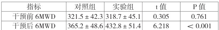 干预前两组6MWD 无显著差异( P>0.05 );干预12 周后,两组均较干预前提升,且实验组提升幅度更大,差异有统计学意义( t=6.218 ,P<0.001 ),提示运动处方可有效增强患者运动耐力。