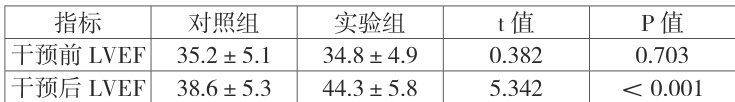 干预前两组 LVEF 水平相近( P>0.05 );干预后实验组 LVEF 显著高于对照组,差异有统计学意义( 1=5.342 , P<0.001 ),表明运动处方可改善心肌收缩功能,促进心功能恢复。