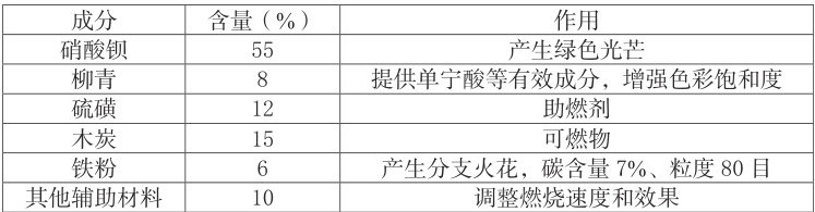 其次,铁粉与分支火花优化:通过实验研究不同粒度(50 目、80 目、120 目)和碳含量( 5% 、 7% 、 9% )的铁粉对分支火花的影响。结果显示,碳含量为 7% 、粒度为80 目的铁粉,在添加量为6% 时,分支火花的分支结构最清晰、亮度最高,且与绿色火焰搭配协调。当铁粉碳含量偏离 7% 或粒度不符合要求时,分支火花效果会明显变差,这与分支火花的生成原理完全一致。