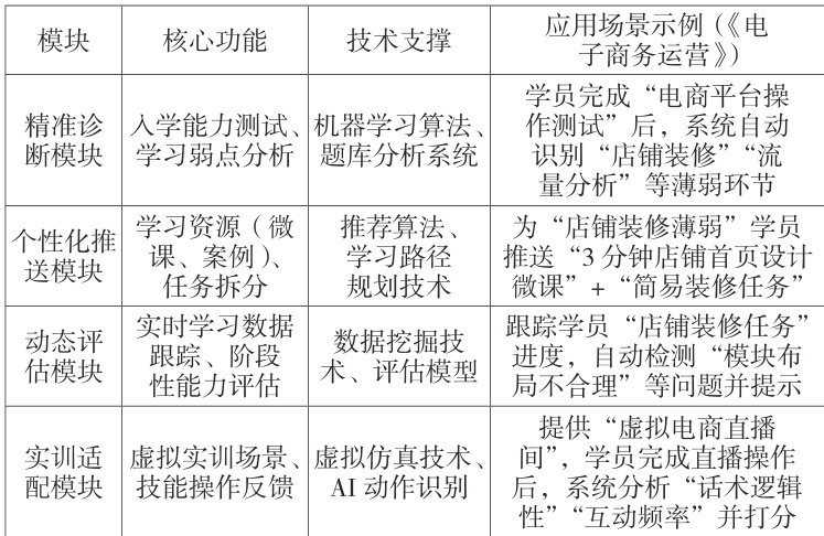 分层推送学习资源:系统按照学员能力画像动态推送资料,针对《电子商务运营》基础较差的学员,推送“零基础店铺注册微课”“简易商品上架案例”,任务主要设置为“完成 1 个基础店铺搭建”;向具备电商经验的学员推送“高级流量投放策略”“直播话术优化案例”,任务以“制定 1 份店铺月度营销方案”为主要内容;《机电设备维修》学员系统按照“故障排查薄弱点”,推送对应的“电机轴承故障排查微课”“电路短路虚拟实训”,并且限制实训操作次数。AI 系统会实时对学员学习数据进行跟踪,例如“微课观看完成率”“实训操作错误率”,若学员出现连续 2 次未完成学习任务或者实训错误率超过 30% 的情况,就自动触发“干预机制”,推送专门的补救资源,且提示辅导教师进行介入指导,防止学员陷入学习困境[2]。