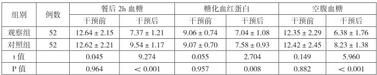 空腹血糖、糖化血红蛋白、餐后 2h 血糖水平系列对比,统计值 >P 值;干预后,空腹血糖、糖化血红蛋白、餐后2h 血糖水平统计值 ⋅
