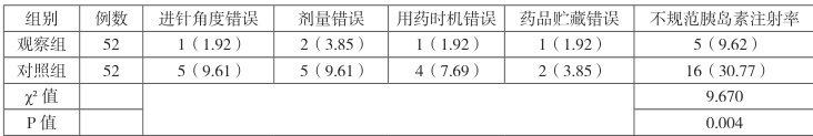 我国属于糖尿病大国,老年糖尿病发病形势严峻,胰岛素是临床治疗糖尿病的常见方式之一,但受各种因素影响,使得农村老年糖尿病患者的胰岛素使用现状堪忧 [5]。特别是针对老年糖尿病患者,因其年龄较大、理解能力和行动力都会逐步降低,加之对于疾病及胰岛素治疗认知度的不足,很容易出现错误用药、胰岛素抵抗等问题,这不仅会影响疾病的治疗有效性与安全性,也会增加心理性胰岛素抵抗或是恐惧等问题,因而需要加强老年糖尿病患者胰岛素治疗中的管理工作。