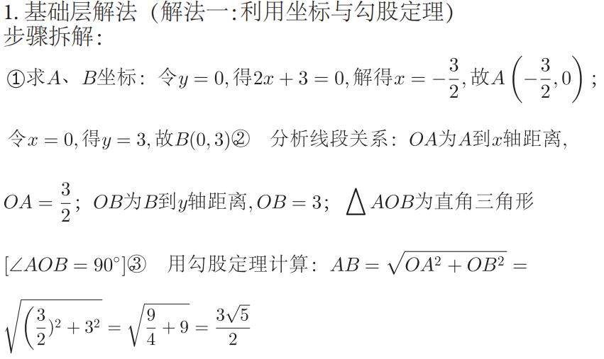 (一)案例1:八年级下册“一次函数与线段长度”(基础层为主,兼顾提升层)例题:已知一次函数 y=2x+3 的图像与 x 轴交于点A,与y 轴交于点B,求线段AB 的长度。