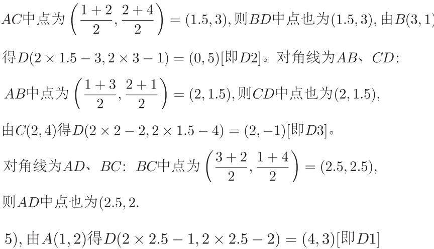 2)=(-1,3) ,解得 x=0,y=5 故 D2(0,5) 。补充漏解:AB 为对角线时,中点重合[解法二思路],得 D3(2,-1) ,最终存在3个点 D