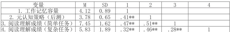 H1 :工作记忆容量、元认知策略使用水平与英语阅读理解成绩两两之间均呈显著正相关。