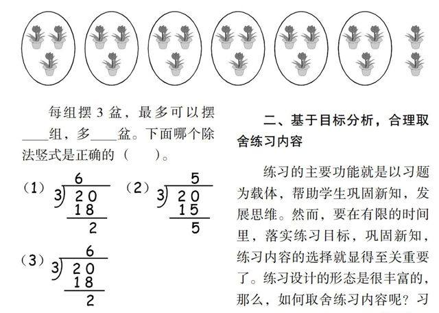 练习的主要功能就是以习题为载体,帮助学生巩固新知,发展思维。然而,要在有限的时间里,落实练习目标,巩固新知,练习内容的选择就显得至关重要了。练习设计的形态是很丰富的,那么,如何取舍练习内容呢?习题设计的目的是为了实现教学目标,应该从教材和学生的实际出发,选取与练习目标相匹配的内容,舍弃与目标不相符或者低效的内容。