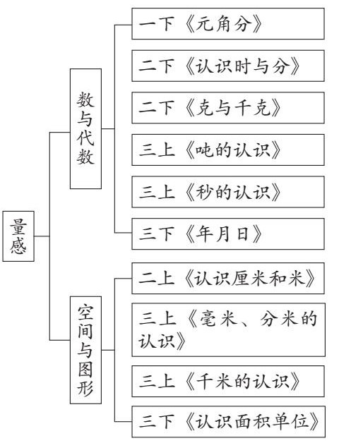 小学低段通过学习“常见的量”从而培养学生对长度、时间、质量、面积这四方面的“量感”,逐步建立起对“量”的感受。由于小学数学教材中没有直接讲“量与计量”的篇幅,而低段涉及“量与计量”的内容主要分布在以下教材中(见左图)。