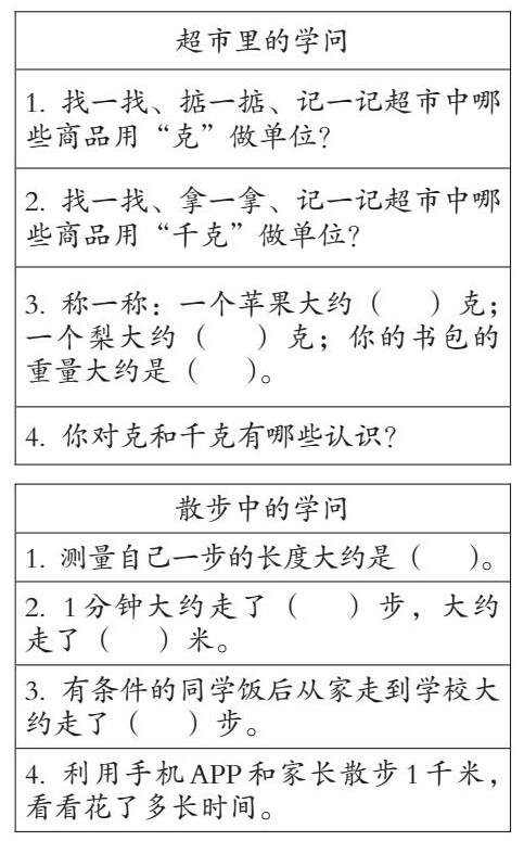 例如,在教学“克与千克”这个单元之前,根据教材内容,让学生提前去超市找一找、掂一掂、称一称,以自己亲身体验的结果作为课堂素材,更加亲近,更加实际。