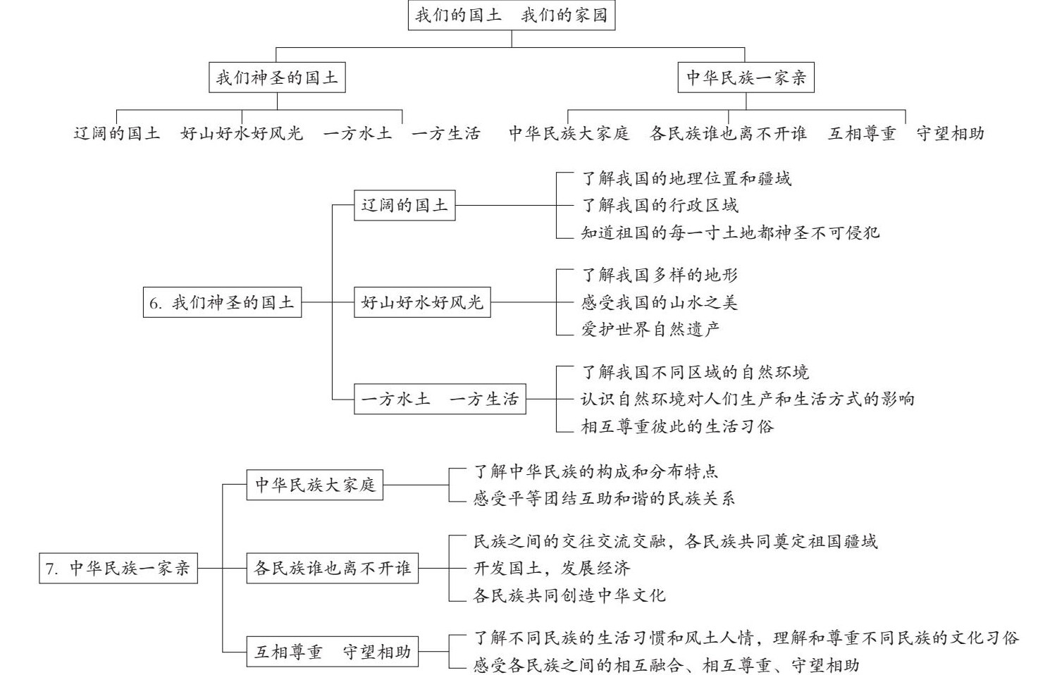 本单元由两课组成,分别是第六课“我们神圣的国土”、第七课“中华民族一家亲”。单元整体教学目标主要有以下两点: