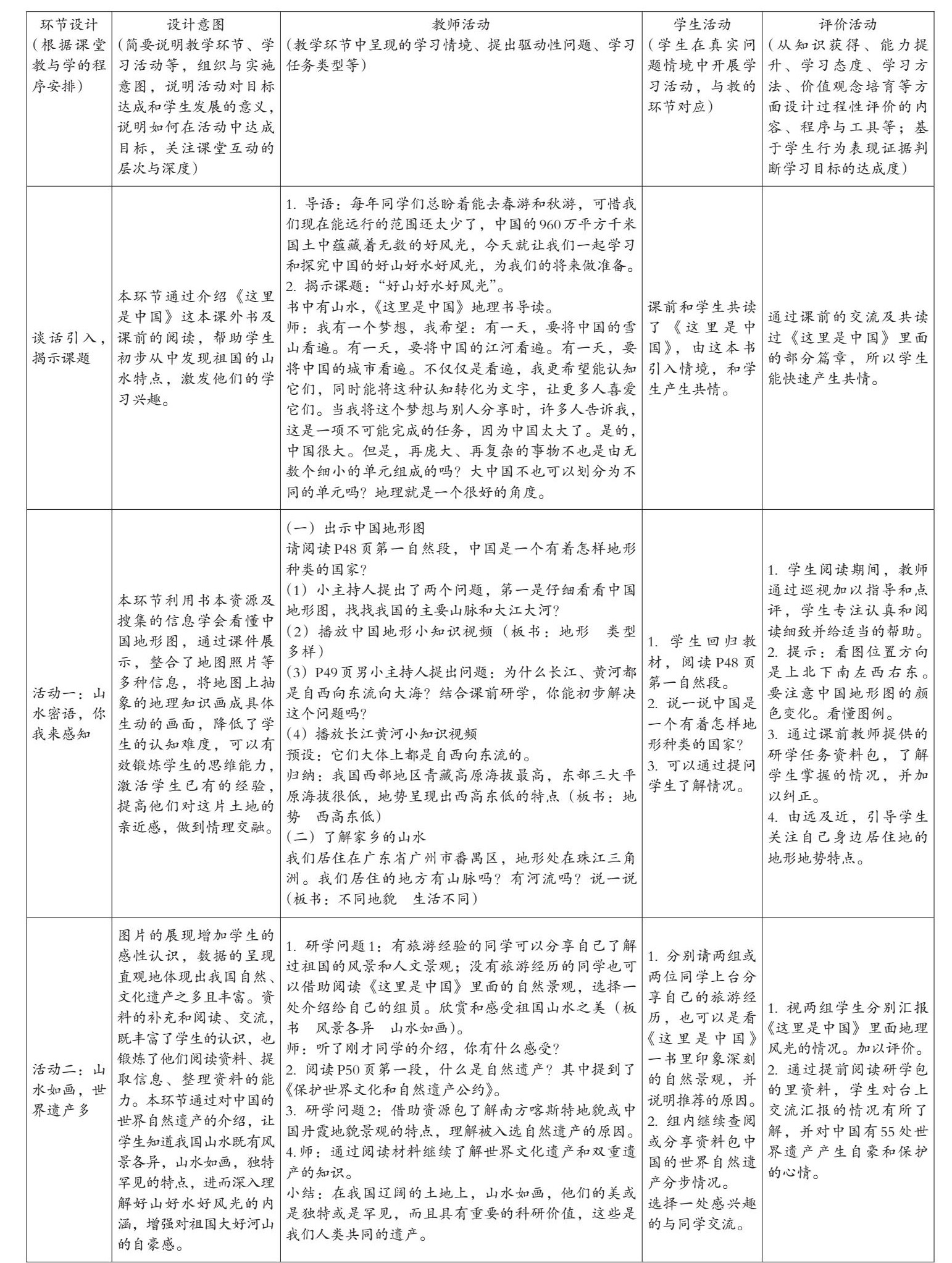 “研学后教”是番禺区课堂教学改革的一种模式。课前由教师根据课堂教学目标、学生学情编制研学案,按研学后教的模式。课前要做到学情分析,找准学生生活经验的结合点,我校是城郊结合处的学校,笔者做课前调查时发现有旅游经历的学生太少,课堂上能分享祖国美丽景观并能产生共鸣成了较难能完成的任务,本课的教学必须拓展学生的资料来源,提升学生的生活经验的感受。课前了解到某位学生的姑妈是旅游和阅读爱好者,经她推荐2019年出版的地理书籍《这里是中国》作为全班课前研学的阅读资料。课前两周,笔者让大部分经父母同意的学生准备了《这里是中国》这本优质的地理书,虽然做不到人人一册,但做到了研学小组内有4至6本书组内分享,鉴于班级学生的学情,帮学生准备了探究资源包,里面的内容涉及中国的地形视频,长江、黄河的基本知识,中国喀斯特地貌和中国丹霞地貌资料,世界遗产的相关知识及我国世界遗产的情况。