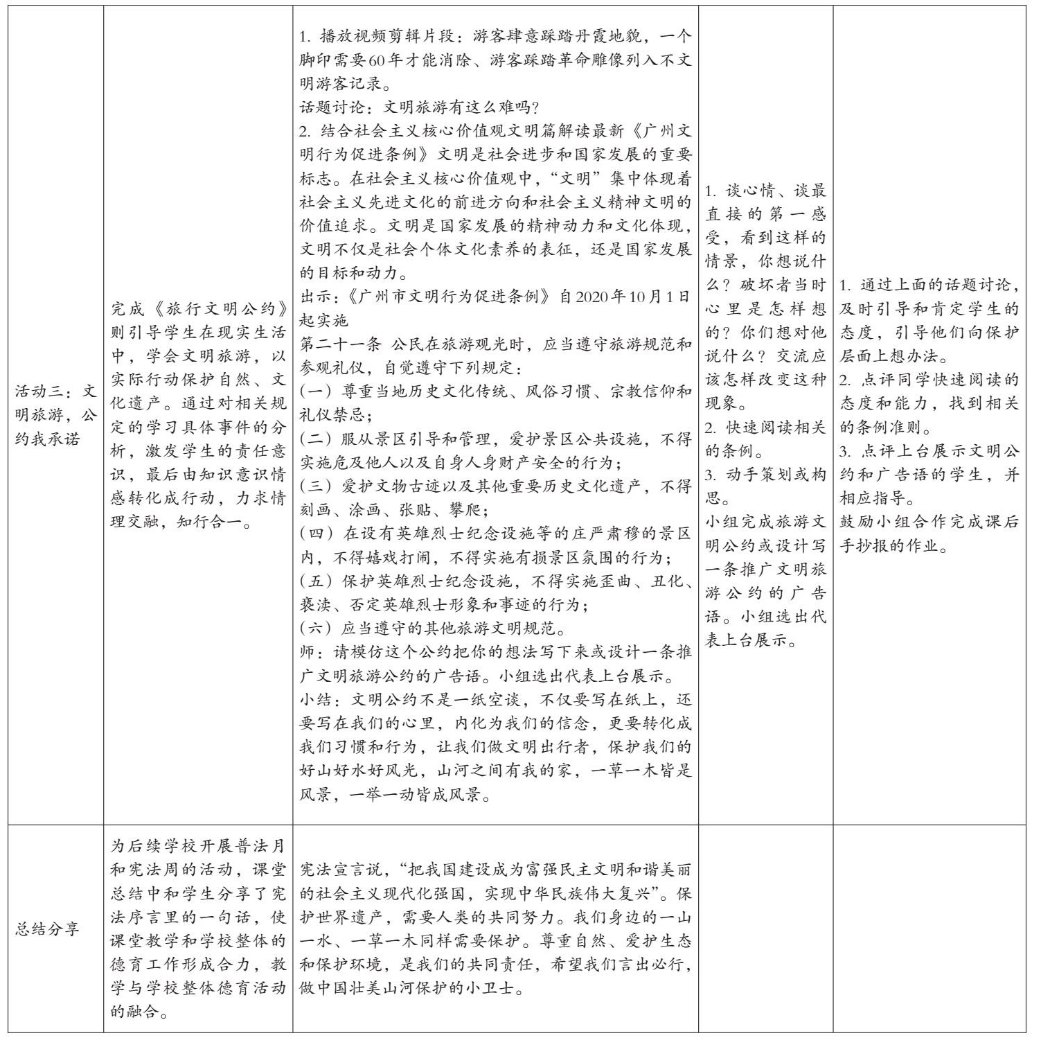 所以在此课例中,笔者把新闻热点2020年10月1日颁布的最新条例《广州市文明行为促进条例》作为课程资源,其中第二十一条就是关于文明旅游的条例,引入课堂学习与思考,产生旅游时如何做到文明这个话题,激发学生想说的欲望和表达的情感。自然地对学生渗透环境教育和法治教育,通过显性和隐性的方式将社会主义核心价值观贯穿始终,突出德育课程的育人价值。教学时对社会主义核心价值观“文明”一词进行解读。