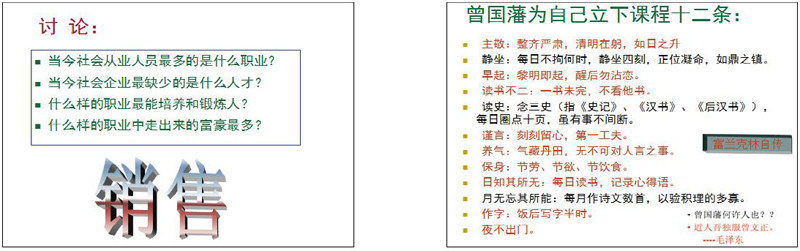 在本课程开学第一课, 就进行了课程入门讨论(如左下), 使学生对课程产生兴趣,并懂得想做好销售工作,必须要有恒心 和毅力。然后我引入了“曾国藩课程十二条”和《富兰克林自传》 中的内容(右下),讲解毛泽东为什么敬仰曾国藩,引导学生一开 学就要养成良好的生活习惯并最终达到自律。
