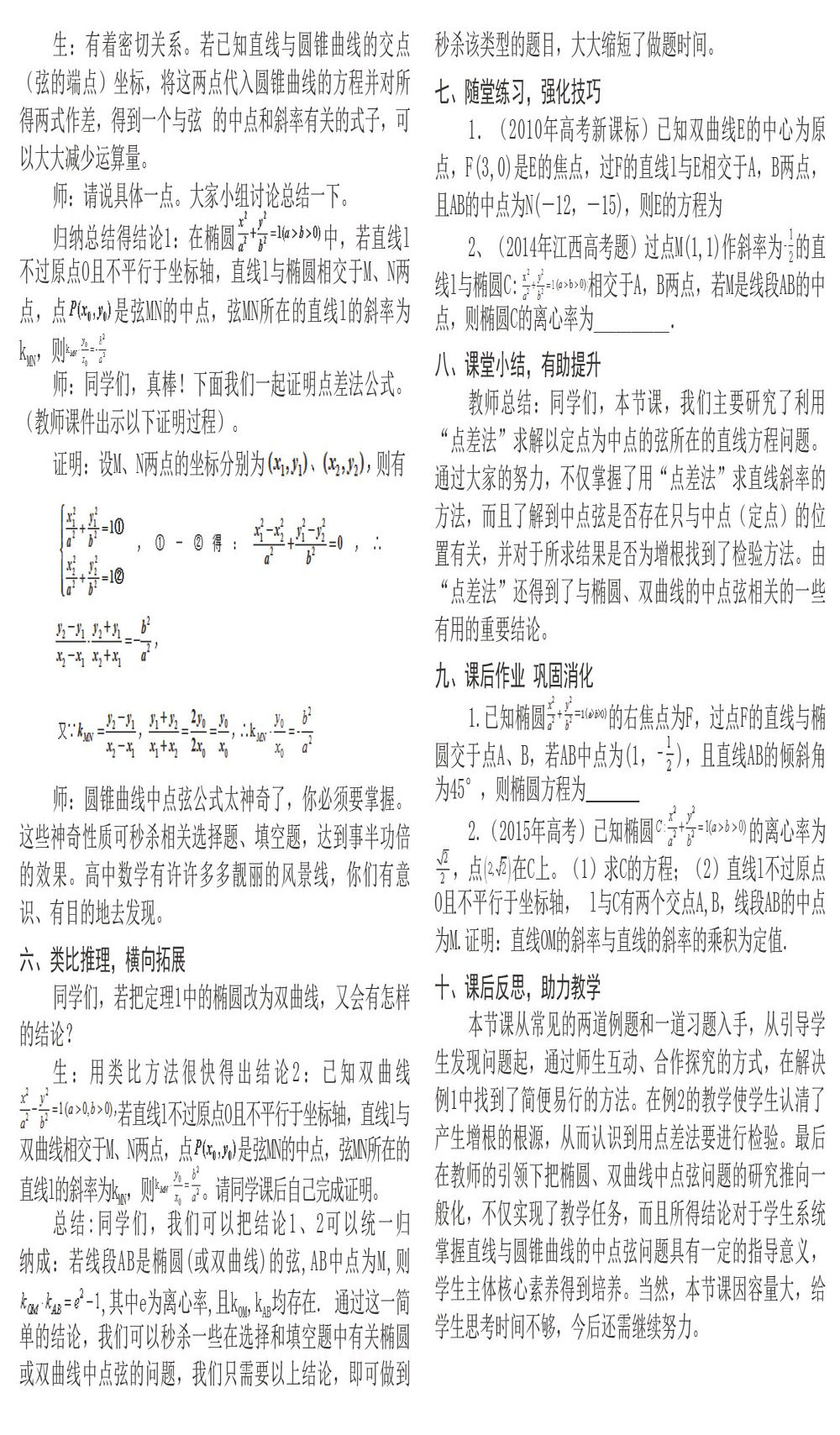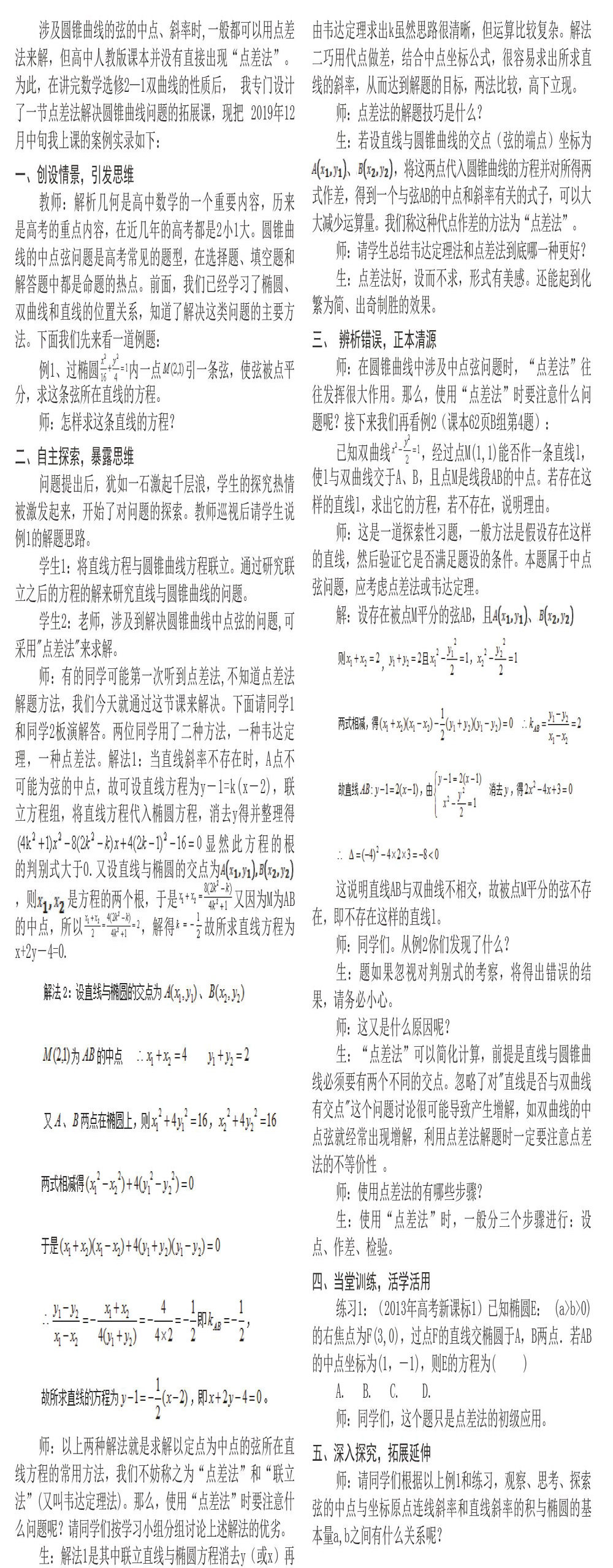 涉及圆锥曲线的弦的中点、斜率时,一般都可以用点差法来解,但高中人教版课本并没有直接出现“点差法”。 为此,在讲完数学选修2—1双曲线的性质后, 我专门设计了一节点差法解决圆锥曲线问题的拓展课,现把 2019年12月中旬我上课的案例实录如下: