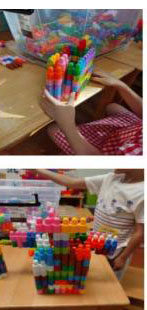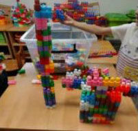 我说:“范曼绮,你们在搭什么呀?”范曼绮抬起头说:“汪老师,你看,我们四个在搭围栏。”“一直在搭围栏吗?我感觉你们很忙碌,但是...”我指了指她们的短短的围栏,又说了:“你看出来了吗?”杨语萱听到了我们的谈话,说:“是呀,我们几个在搭围栏,可是姐姐妹妹一会说这个不好,一会说那个不好,一会又去搭这个,一会又去搭那个,所以围栏就这点了。”于是,我去找了姐姐妹妹,我说:“姐姐妹妹,你们今天搭了什么呀?”姐姐说:“我们想搭围栏,可是感觉一点不好看。”妹妹也说了:“是呀,汪老师,我觉得围栏这样子一点不好看,你说怎么办呀?”我说:“你们发现了问题,很好,但是怎么解决,你们想到了吗?”“没有。”她们两个异口同声的说道。我说:“我想你们可以去那边材料库看看,会不会有什么发现。”她们两个来到材料库,寻找了一番,找到了几张图示,是其他积木的图示,但是她们翻到了围栏的样子,她们拿着图示在旁边研究,不一会儿,围栏就搭好了。