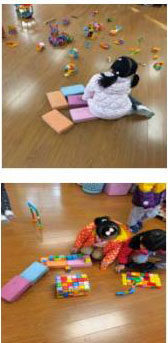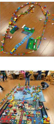 我们班从10月开始尝试把建构作品放在教室中间进行主题式组合搭建。在开始的第一周,孩子们处于不知道怎么把作品组合起来,以至于搭建出来的区域很小、很杂乱。