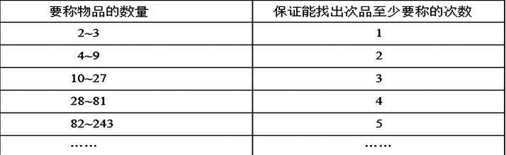 1.思考问题:至少称3次最多能从多少物品中找出次品?4次呢?