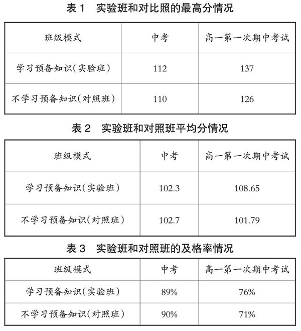 高一新生能够有效的进行预备知识的学习;对学生进行系统的预备知识的学习以后,学生的数学成绩明显高于未进行预备知识学习的学生。