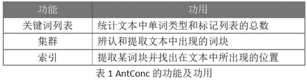 本研究借助语料库研究工具AntConc,主要使用关键词列表(Word List)、集群(Clusters)、索引(Concordance Plot)这三大功能,如下图表1所示:
