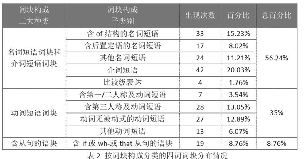 如上表表2分布情况所示,名词短语词块和介词短语词块占词块构成比重最高,为56.24%。其中,主要为含of结构的名词短语和介词短语。动词短语词块所占比重为35%,其子类别中,含第三人称及动词短语的词块与动词无被动式的短语词块占主要构成。