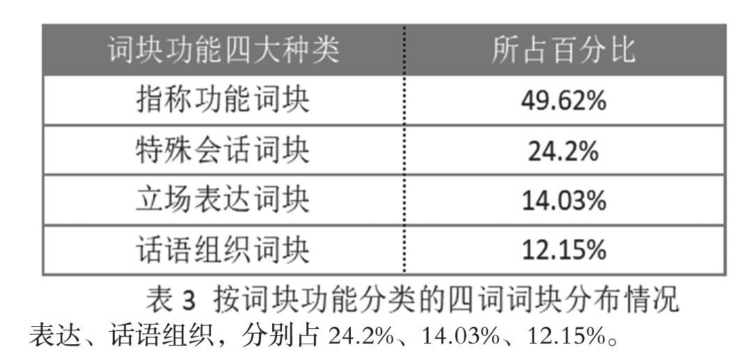 由表3可知,在214个词块中,指称功能词块所占比例为49.62%,在四大功能中占第一位。其次是特殊会话、立场表达、话语组织,分别占24.2%、14.03%、12.15%。