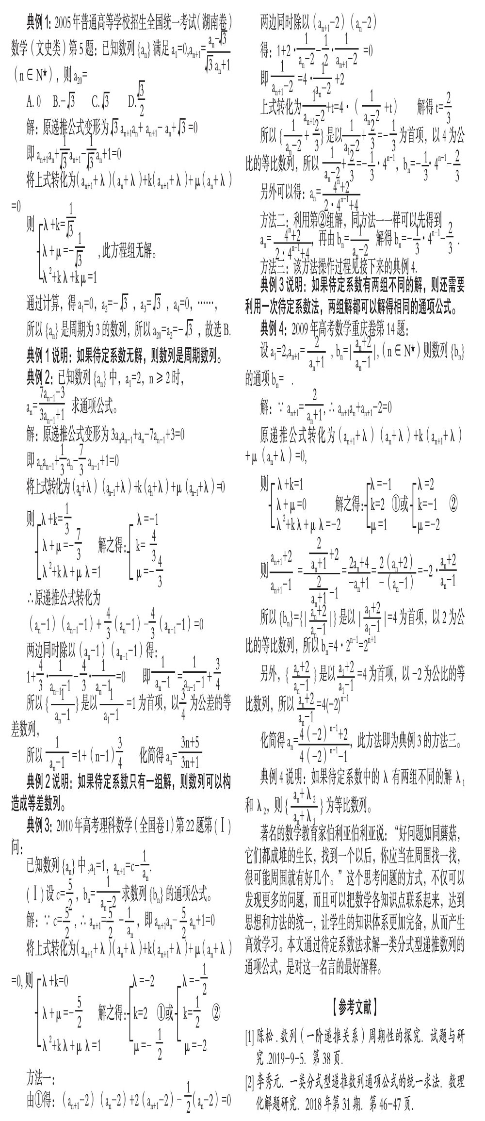 【摘要】本文通过几个典型例题、几种不同策略,先将一类分式型的递推数列表示成另外一种含有待定系数的整式形式,接下来求解待定系数,再根据待定系数的解的个数来求解数列的通项公式,最后求出一般情况下的通解公式。