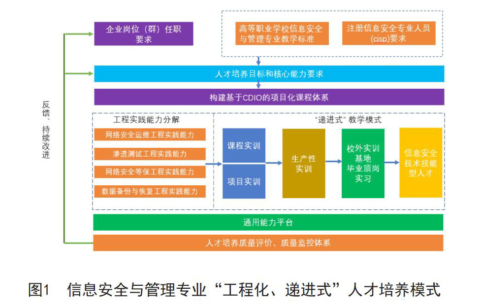 专业参照《高等职业学校信息安全与管理专业教学标准》、注册信息安全从业人员(CISP)要求和企业职业岗位(群)的任职要求,以“信息安全技术技能型人才培养”为目标,以“信息安全的构建、设计、实现和运行”为职业核心能力要求,通过“网络安全运维”、“渗透测试”、“信息安全等保”以及“数据恢复”等系统化的工程项目实践,采用“校内实训室课程实训→校中企业项目化实训→生产性实训→校外实习基地顶岗实习”的递进式教学组织模式,促使学生一体化地获得 CDIO 大纲所要求达到 4 个层面的能力,即技术知识与推理,个人与职业技能,人际交往能力,在企业和社会环境下的构思、设计、实施与运行(CDIO)等四个方面。