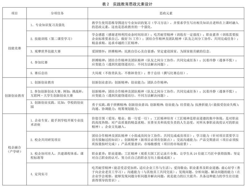 通过实践教育渠道进行课程思政,效果相对比较显著。第一,技能竞赛。通过技能竞赛培养学生勇于拼搏、团结合作的精神,以及精益求精、追求卓越的职业精神;第二,创新创业教育。培育在校学生的创业意识、创新精神、创新创业能力。第三,校企合作,产学研有机融合。通过校企融合突出价值引领、工匠精神培育、企业文化融入,培养出具备社会主义核心价值观、工匠精神、具有崇高职业道德和职业素养的高素质高技能型人才。