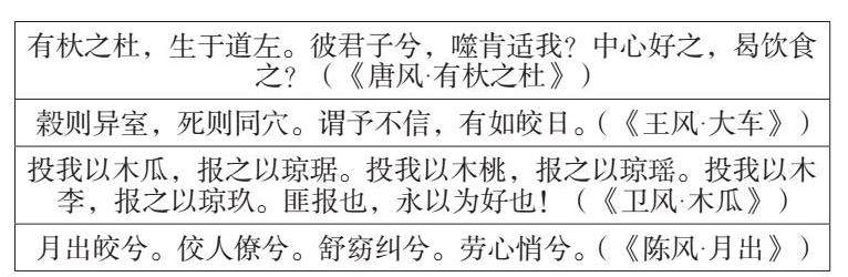 以上诗歌都是恋歌,《唐风·有杕之杜》是女子向男子示出好感的诗歌6,用一株杜梨独自长路边来表示自己的孤单,想要心上人来陪伴,对他发出邀请。《王风·大车》是女子大胆而矜持表达对情人的热恋的诗歌6,女子发出“死则同穴”的誓词,以示对爱情的忠贞,对恋人的浓烈的爱。《卫风·木瓜》是男女互赠定情信物以表达爱意的定情诗6,女性送木瓜、桃子、李子给情人,情人回赠美玉,表示两厢情好,达成定情。《陈风·月出》是月下男女思念的爱情诗7。月亮是中国诗歌永恒的主题,在这首诗中,诗人把月亮和女人联系起来,用明亮的月光来比喻女性美丽的外表,对月怀人。