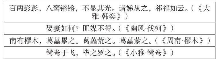 以上诗歌都是婚嫁诗,《大雅·韩奕》描写了贵族韩候娶妻的场景,装饰辉煌的百辆车去迎亲,妻子的陪嫁人员和嫁妆多如彩云,可见当时贵族结婚的场面之盛大华丽,也侧面的显示出贵族结婚的奢侈。《豳风·伐柯》告知求娶妻子的方法6,需要父母之命,媒妁之言,这揭示了当时的婚嫁习俗,而且此习俗一直沿用到现在,可见《诗经》影响之深远。《周南·樛木》是祝贺新郎新婚的诗歌6,在诗中,描绘了挺直的松树上缠绕着弯曲的野生葛根藤蔓,松树不受干扰且不容易动摇,表示男子将娶女子为妻,祝贺他们生活愉快。《小雅·鸳鸯》是描写人们对贵族男女结婚的祝贺6,鸳鸯是一种水鸟,一生雌雄成双成对,这里用鸳鸯比作新婚夫妻,表示对彼此忠贞不二、矢志不渝。