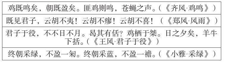 以上诗歌是婚姻诗,《齐风·鸡鸣》是妻子催丈夫起床的诗歌,黎明时鸡啼意味着一天的开始,妻子催丈夫起床但丈夫赖床发生的对话,表现了夫妻的恩爱。根据序言,《郑风·风雨》是妻子和丈夫久别重逢的诗歌6,外面风雨交加,屋里夫妻相聚温馨,里外形成鲜明的对比,展示妻子对丈夫归家的欣喜。《王风·君子于役》抒发了妻子对服役在外丈夫的思念之情7,用鸡回笼、牛羊回圈、夕阳西下等日常意象来表达妻子深沉而强烈的情感,让读者感到妻子对丈夫回家的渴望。《小雅·采绿》是思念丈夫的诗歌7,用妻子采蓝草却才不满的意象,说明妻子心不在焉,一边干活一边思念丈夫,可见思念之深。