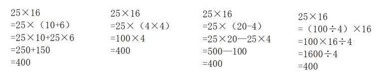 学生针对某一题的多种算法后,要引导学生交流思考方法,注意不同方法的比较。对这些方法中不同之处抓类、化相同之处抓沟通,使方法与方法建立联系,形成结构。例如复习《运算定律与简便运算》时,在课本中就有这样一题:25乘16。在复习时就要发挥此题的功能,引导学生去探究多种解决方法: