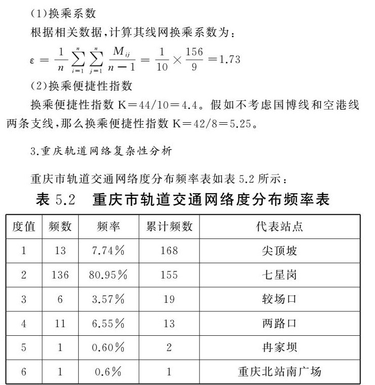 对可达性的分析中,可得出重庆轨道交通网络中3号线、6号线和环线的可达性最好,其指标为最高的20.00;对连通性的分析中,得出线路间的平均换乘次数为1.73次,重庆市城市轨道网络的换乘便捷性指数为4.4;对线网复杂性的分析中,换乘站所占的比例较少为11.31%,数目仅为19座。重庆市的轨道网络复杂性的聚类系数为0,表明重庆市轨道网络中不存在三个站点互相相连的情况,对换乘便捷性的影响影响程度较小。