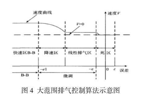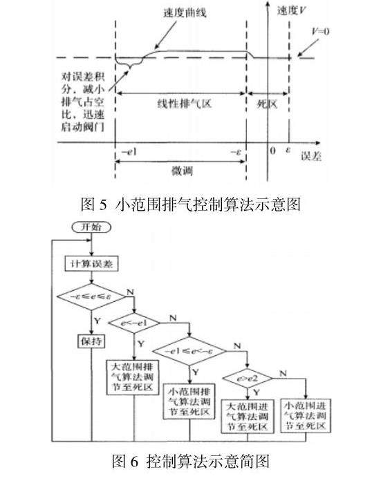 即控制过程 中判断是否需要引入积分环节的速度分界点,v1为进气的速度分界点,一v2为排气的速度分界点。在实际控制中,若误差还在死区范围以外,而速度又低于V1,或者大于一v2时,需要增大进气口或者是排气口,以减少调节时间。当行程满量程在lv左右时,可选择vl=v2=2mV/100ms。