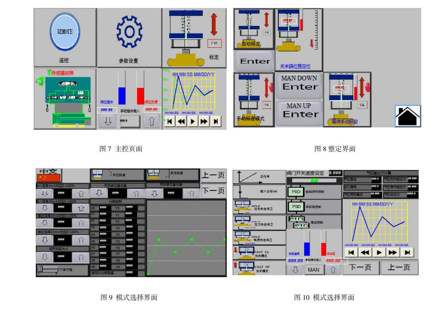 控制策略及整定算法确定后,需要设计一个人机交互性能良好的操作界面,该项目采用触摸彩屏交互技术,对涉及的状态参数显示、模式选择、故障报警、趋势历史、参数设置等功能进行集中显示及操作。采用触摸彩屏的好处就是人机交互性能较好,能够快速地读取参数、运行状态及故障状态,并能够方便地进行参数设置及模式选择。主要人机界面有:主控页面(图7)、整定界面(图8)、模式选择界面(图9)、模式选择界面(图10)、参数设置界面(图11)。