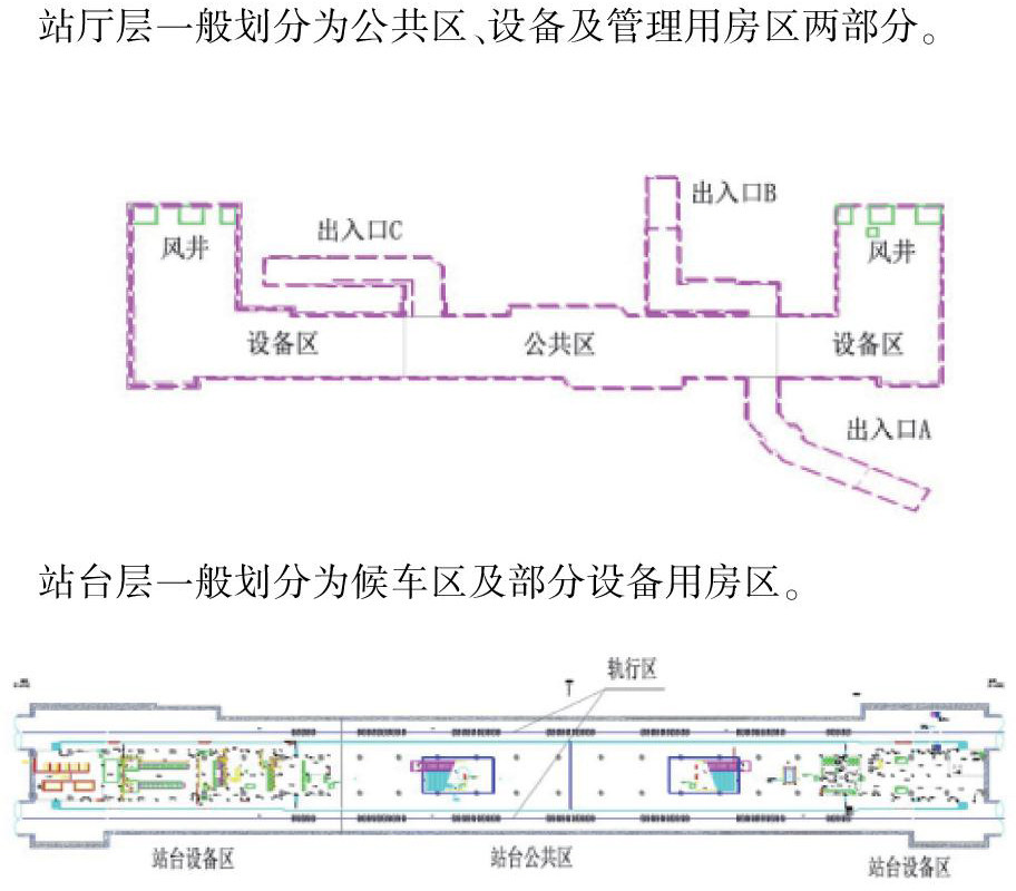 地铁车站一般由站厅层、站台层及人行通道、地面出入口、风道、地面风亭等使用空间组成。车站使用空间应按运营要求划分功能分区,可分为乘客公共区,设备与管理用房区。