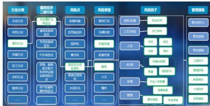 行业-风险点类型-风险点-风险类型-风险因子(人、物、环、管要素)-管控措施(技术措施、管理措施、培训措施、防护用品、应急处置五类)其各自规则组成一个行业的风险清单,进而形成逐级紧扣的关联关系,若干因素条目化,行业风险清单化,通过应用端的高效筛选,根据结果进行计算,综合评价输出风险点等级结果。