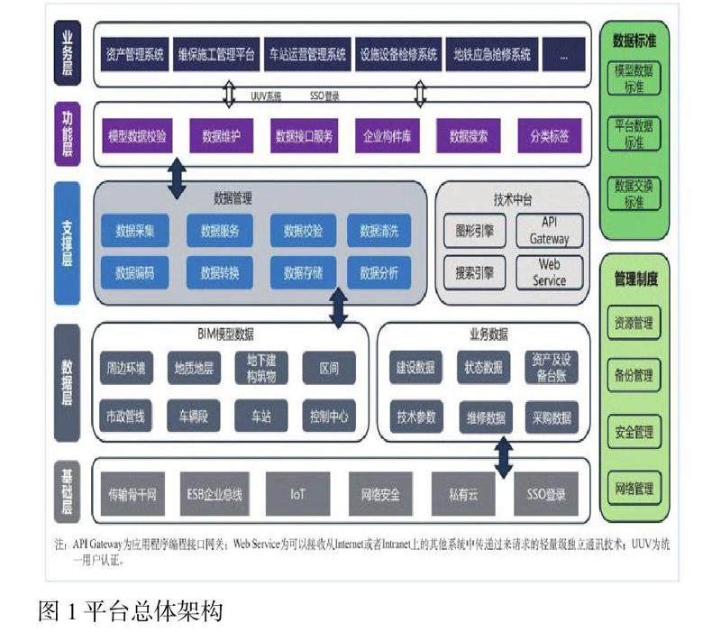 轨道交通建设一体化全过程管控平台立足企业数字化转型整体规划,为企业既有业务系统提供可视化改造、模型数据共享的综合解决方案。其总体架构分为基础层、数据层、支撑层、功能层和业务层,如图1所示。(1)基础层。基础层是平台底层运行的支撑。传输骨干网是企业各业务系统间数据传输、协同运作、无缝集成的基础;企业服务总线(ESB)支持与异构系统的集成;物联网(IoT)、网络安全、私有云、单点登录(SSO)等系统可提供硬件网络安全方面的服务和保障。(2)数据层。数据层是平台的数据底座,分为BIM模型数据和业务数据两大类。(3)支撑层。支撑层负责提供与业务系统关联的数据采集、存储、分析等数据管理服务,并通过图形引擎、搜索引擎、应用程序编程接口(API)、WebService等构建技术中台。(4)功能层。功能层包含平台的各项业务功能模块,如模型数据校验、数据维护、数据接口服务、数据搜索、分类标签等功能。(5)业务层。业务层负责对接企业的各大业务系统,如资产管理系统、维保施工管理平台、车站运营管理系统、设施设备检修系统等。在功能应用方面,该层可整合BIM设计协同、BIM建管、BIM运维等平台,以及各种静态、动态业务数据,实现基于BIM技术的数字化竣工决算、数字化交付等业务。