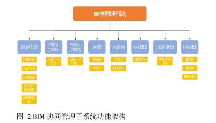 BIM协同管理子系统能够对BIM模型进度与质量进行管控。该子系统满足全生命周期各参建方BIM模型的流转、展示、应用与管理工作。通过对协同管理权限进行分配,动态维护模型及数据的关联关系,提高对BIM工作参与方的过程文件、成果文件的管控能力,提升对BIM管理过程与成果的管理水平,实现工程项目从前期(设计)、建设期(施工)到后期(移交运营)整个生命周期中的各方、各阶段的数据高效集成、传递、共享。BIM协同管理子系统主要通过BIM三维协同管理及设计施工一体化应用,使项目各参建方开展协同工作,实现所有工点所有专业的协同管理。系统实现的内容包括三维展示、BIM调度、BIM成果审查、BIM进度管理、BIM应用方案管理和BIM成果管理等功能,如图2所示。