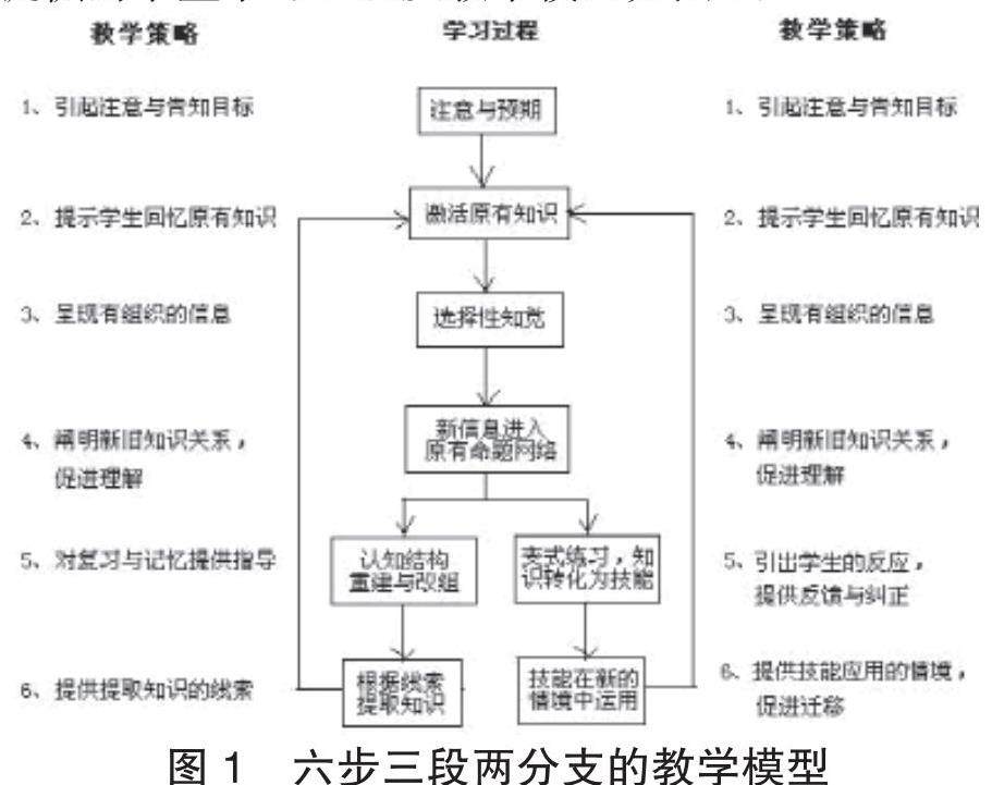叶圣陶先生强调教学是教师帮助学生学习,因此了解学生的学习心理过程将直接作用于教师的教。六步三段两分支的教学模型是华东师范大学课程与教学研究所的研究成果。他们提供的学生学习心理及教学模型如图1: