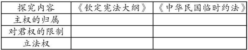 教师活动:活动探究二:《中华民国临时约法》之新新在哪里?(1)提示探究的方法:结合所学知识与教材P48《中华民国临时约法》与以往的封建王朝法律有何不同? (2)投影以下材料即《钦定宪法大纲》和《中华民国临时约法》的部分条文;要求完成以下表格:
