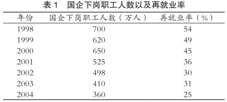 国有企业在最初进行发展的过程中,实际提供的岗位出现了大于本身实际需求的情况,导致国有企业内部出现劳动力过剩的情况,而这种情况造成当前国有企业无法保证经济效益,同时也增加了人力资源的成本,降低了生产效率,如表1所示统计了1998年至2004年国有企业下岗职工人数以及再就业情况。因此为了保证国有企业的经济效益,提升生产效率和生产质量,为国有企业的稳定发展奠定坚实的基础,我国政府部门针对此进行调整和改革,而这也就导致部分企业内部职员下岗,增加了失业人口数量,但是国有企业减员增效是保证国有企业可持续发展的必然途径。