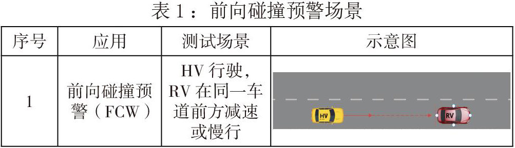 在汽车的智能驾驶或自动驾驶中,V2X具有众多应用场景,常用的应用16类应用场景包括前向碰撞预警(FCW)、交叉路口碰撞预警(ICW)、左转辅助(LTA)、盲区预警/变道预警(BSW/LCW)、逆向超车预警(逆向超车预警)(DNPW)、紧急制动预警(EBW)、异常车辆提醒(AVW)、车辆失控预警(CLW)、道路危险状况提示(HLW)、限速预警(SLW)、闯红灯预警(RVLW)、弱势交通参与者碰撞预警(WRUCW)、绿波车速引导(GLOSA)、车内标牌(IVS)、前方拥堵提醒(TJW)、紧急车辆提醒(EVW)等。依托武汉经开区开放道路自动驾驶示范区,本文对车路协同(V2X)的前向碰撞预警场景进行了测试,相应的场景描述如表1所示。