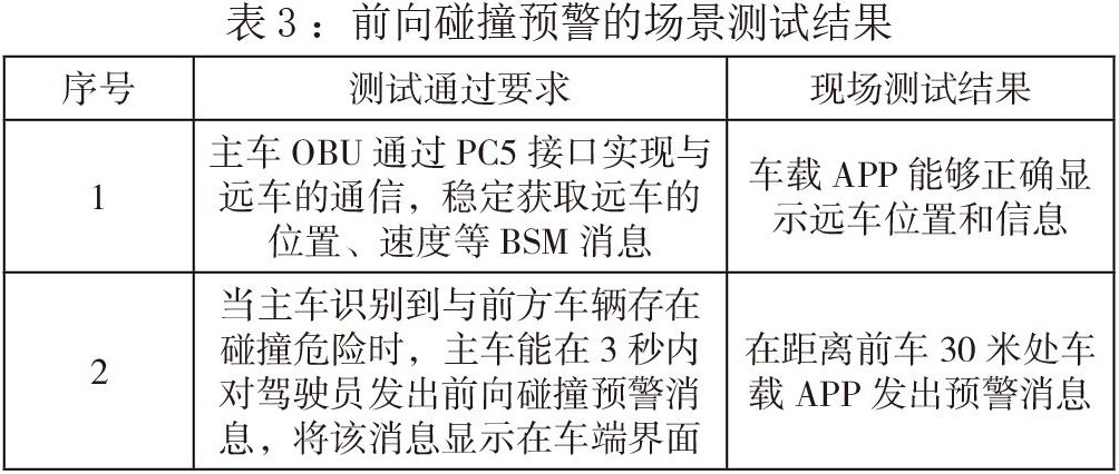 依托武汉经开区的自动驾驶示范区项目,测试结论如表3所示,测试结果显示,该应用在前向碰撞场景中正常发挥其预警作用,达到测试标准,测试通过。