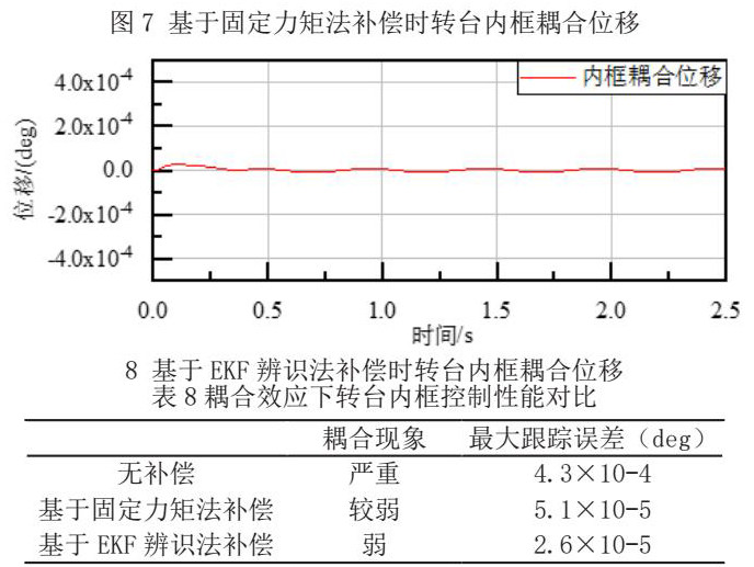 由图7和图8可知,在两种耦合模型的补偿下,转台的耦合位移均发生了下降,且基于EKF辨识法所得的耦合模型,相较于传统的力矩法,能够更好地降低转台发生的耦合位移,提高转台在多轴运动时的定位精度。在两种耦合模型的补偿下,内框的最大耦合位移分别为5.1×10-5deg以及2.6×10-5deg。下表为不同补偿方式下,转台的控制性能对比: