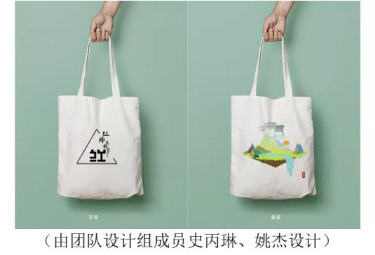 布袋图案简介:作品主要采用扁平式插画的形式,将黔南当地自然风景与人文景观相结合,描绘出一幅充满美感的图案,主体元素以黔南斗篷山为元素,将邓恩铭故居的纪念牌坊放置在山体后方,一轮太阳缓缓升起,象征着革命的希望。