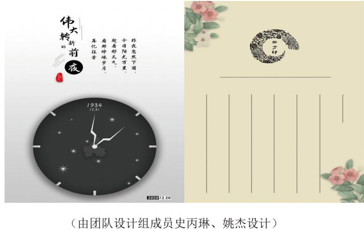 明信片简介:这张明信片的设计背景是红军进入贵州后的重要会议——猴场会议。候场会议被称为伟大转折的前夜,团队设计组成员根据这一点做了钟表样式的时间卡点,在明信片的背面是候场的地图,由此设计了相关的明信片。
